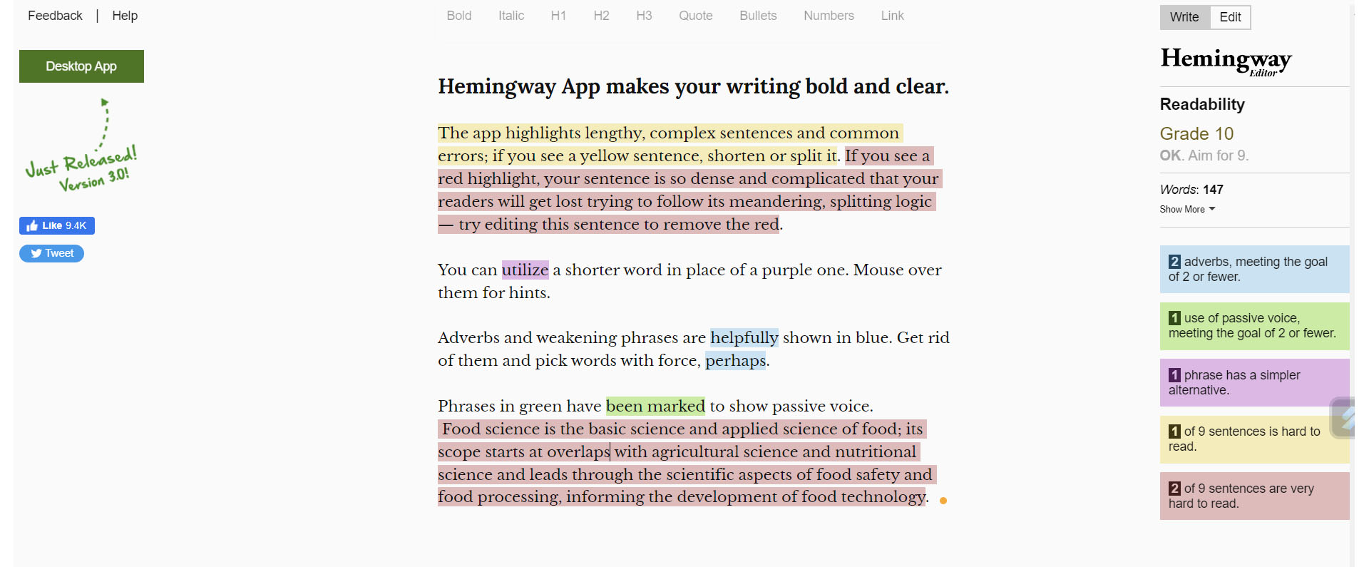 رنگ‌آمیزی عبارات پیچیده: Hemingway Editor عبارات پیچیده و واضح را با رنگ‌های متفاوت مشخص می‌کند تا به داوطلبان کمک کند تا آنها را تجزیه و تحلیل کنند و ساده‌تر نوشته شوند.