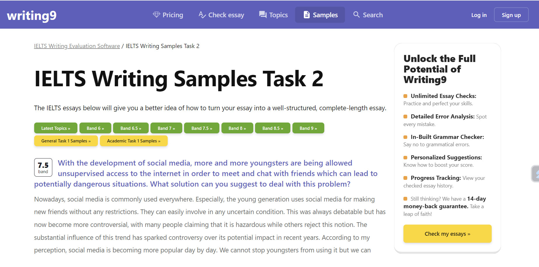 وب سایت Writing9 یک ابزار آنلاین بسیار مفید برای داوطلبان آزمون آیلتس است که به بهبود مهارت نوشتاری آنها کمک می‌کند. این سایت با بهره‌گیری از هوش مصنوعی، تصحیح‌های زبانی و اصلاح متون انجام می‌دهد. با استفاده از Writing9، داوطلبان می‌توانند نمونه‌هایی از مقالات، نامه‌ها، گزارش‌ها و سایر متون آکادمیک خود را ارسال کنند تا تصحیح شده و بازخورد مفیدی دریافت کنند.