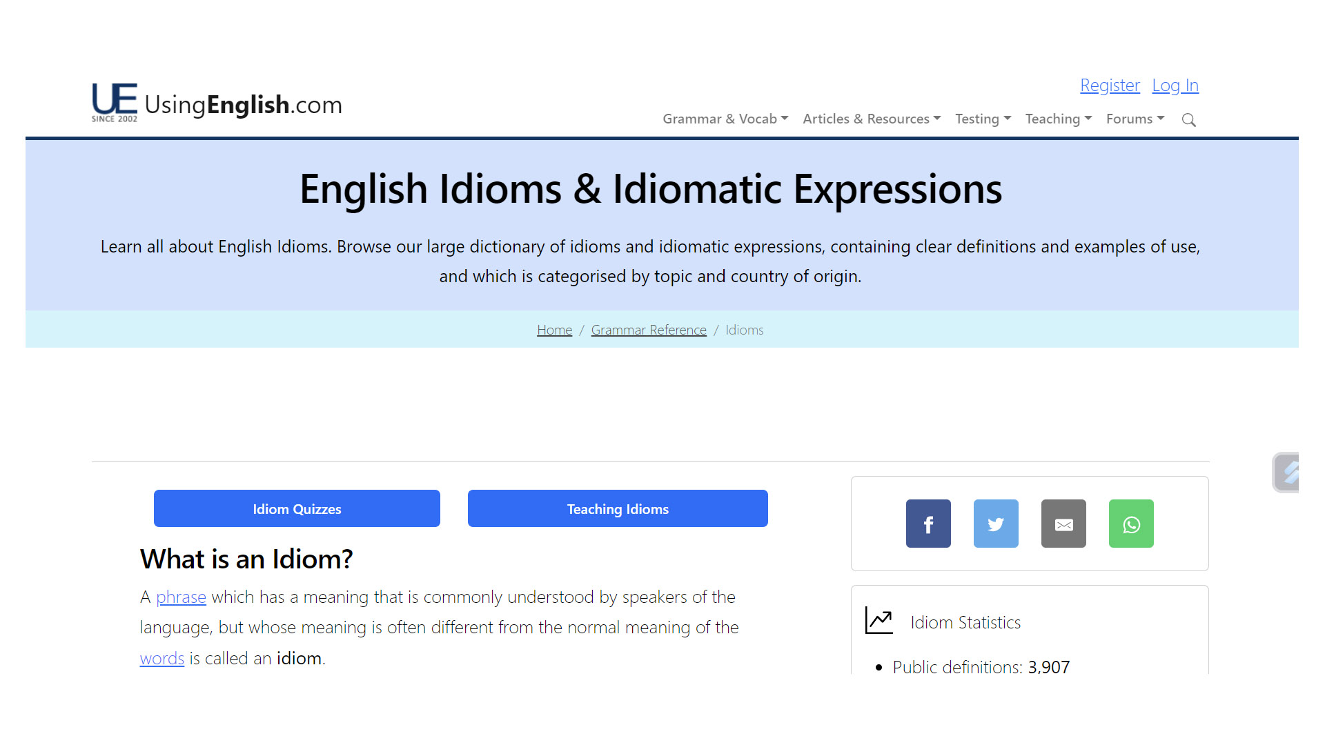 وب‌سایت UsingEnglish.com یک منبع آموزش زبان انگلیسی بسیار معتبر و مناسب برای افرادی است که می‌خواهند مهارت‌های زبان انگلیسی‌شان را بهبود بخشند و با استفاده اصطلاحات کاربردی شبیه آمریکایی ها به راحتی صحبت کنند. این سایت که یکی بزرگترین و محبوب‌ترین منابع آموزشی آنلاین برای زبان انگلیسی است، به طور کامل موارد زیر را پوشش می‌دهد: